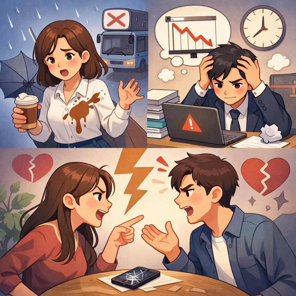 - 연속된 사소한 꼬임은 초조함을 키우고, 초조함은 말투를 날카롭게 만든다.