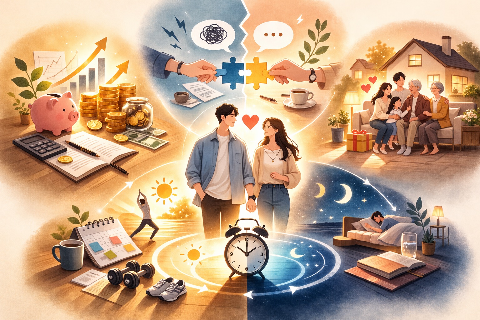 사랑의 감정이 아니라, 현실 운영에 대한 구체적 합의입니다. 돈·가족·리듬을 ‘말로’ 정리해두면, 불필요한 추측이 줄어듭니다.